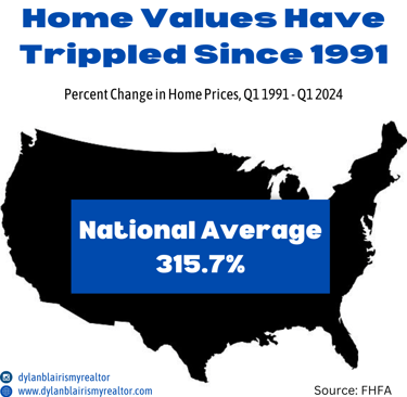 The real estate market in the United States has seen remarkable growth over the past few decades. According to the Federal Housing Finance Agency (FHFA), home values have tripled since 1991, with a national average increase of 315.7% from Q1 1991 to Q1 2024. This substantial appreciation highlights the enduring value of real estate as an investment and underscores the benefits of homeownership.